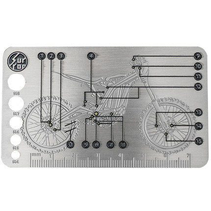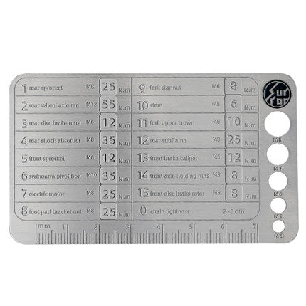This wallet-sized metal Light Bee torque card provides torque ratings for various parts of the Light Bee, a 7 cm ruler, and bolt measuring holes.