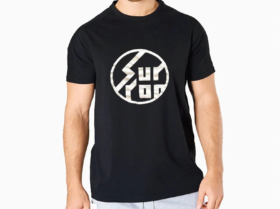 This simple black shirt is 100% cotton and makes a simple, yet effective, statement with its special circle logo graphic.