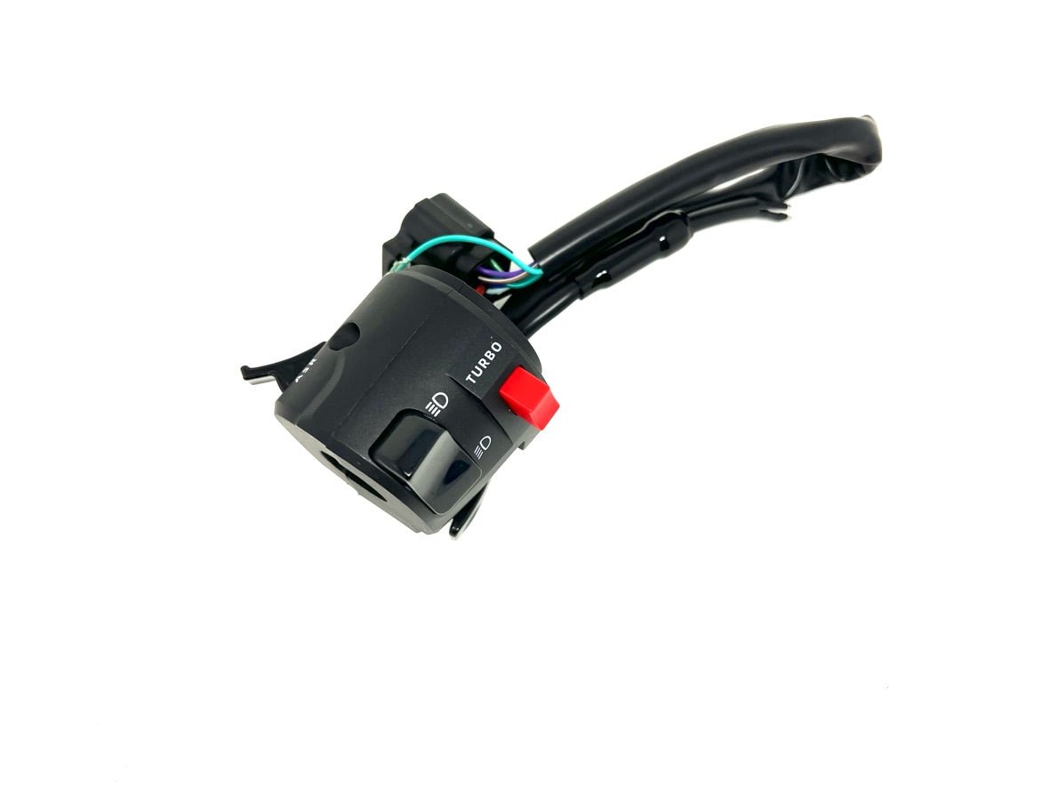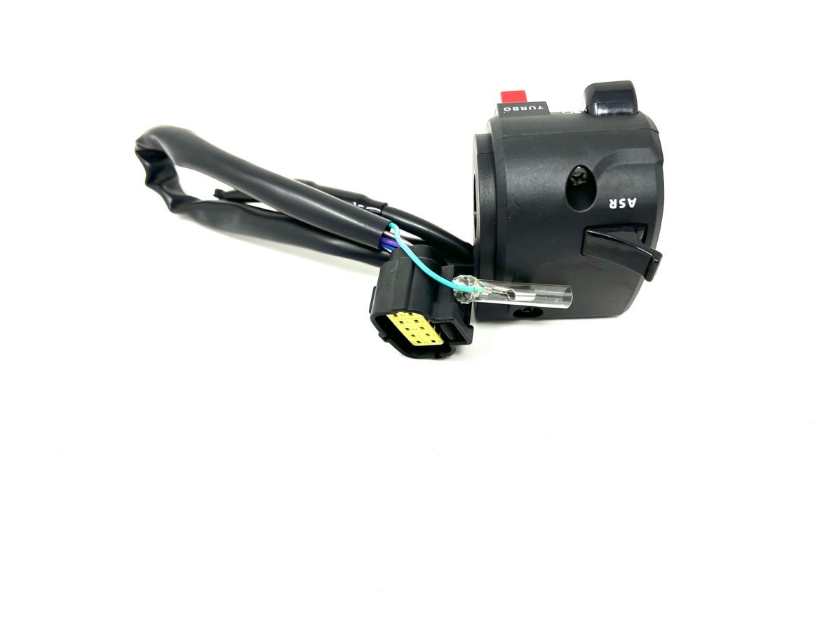 Stock left multifunctional handlebar control, including headlight control, ASR traction control, horn, and turbo.